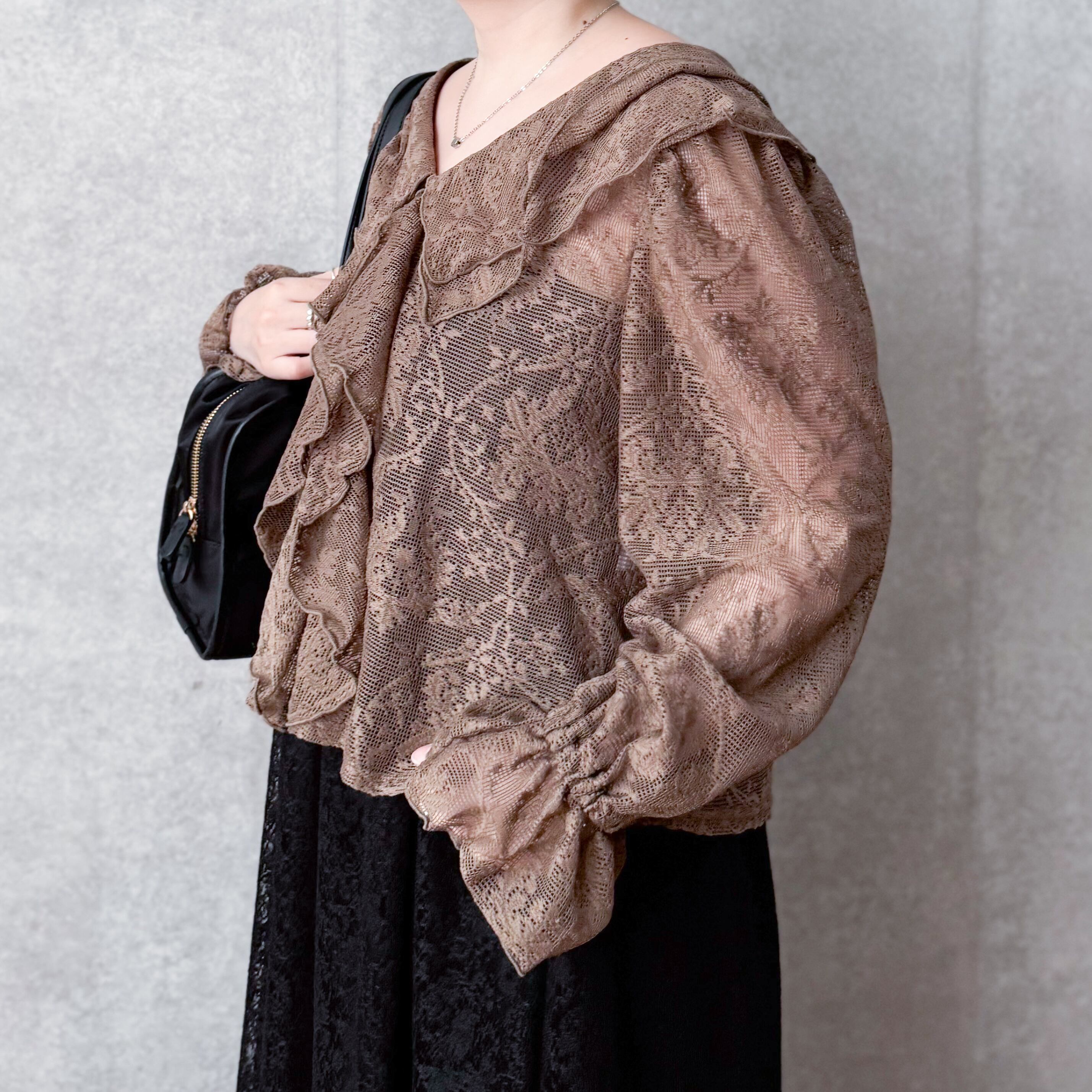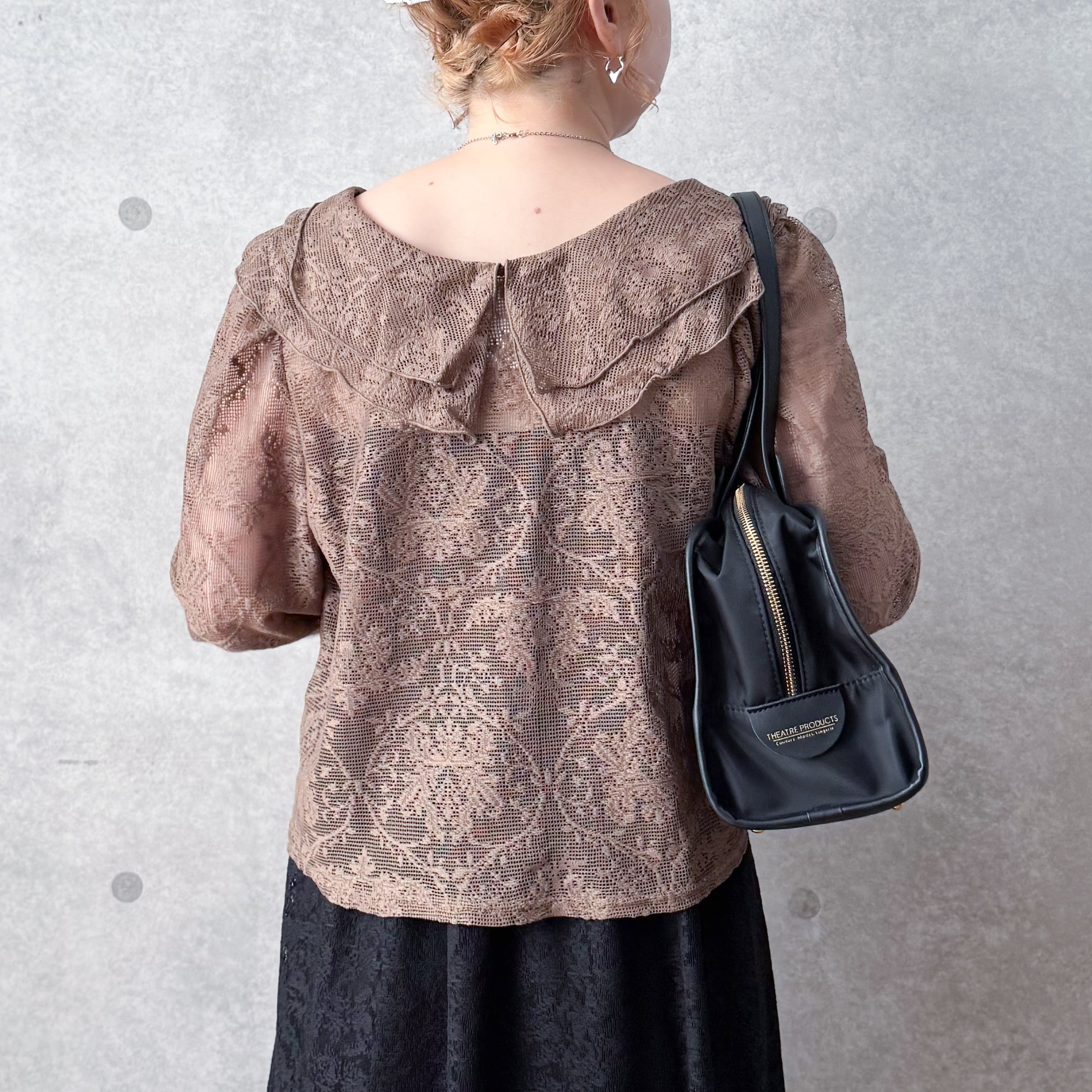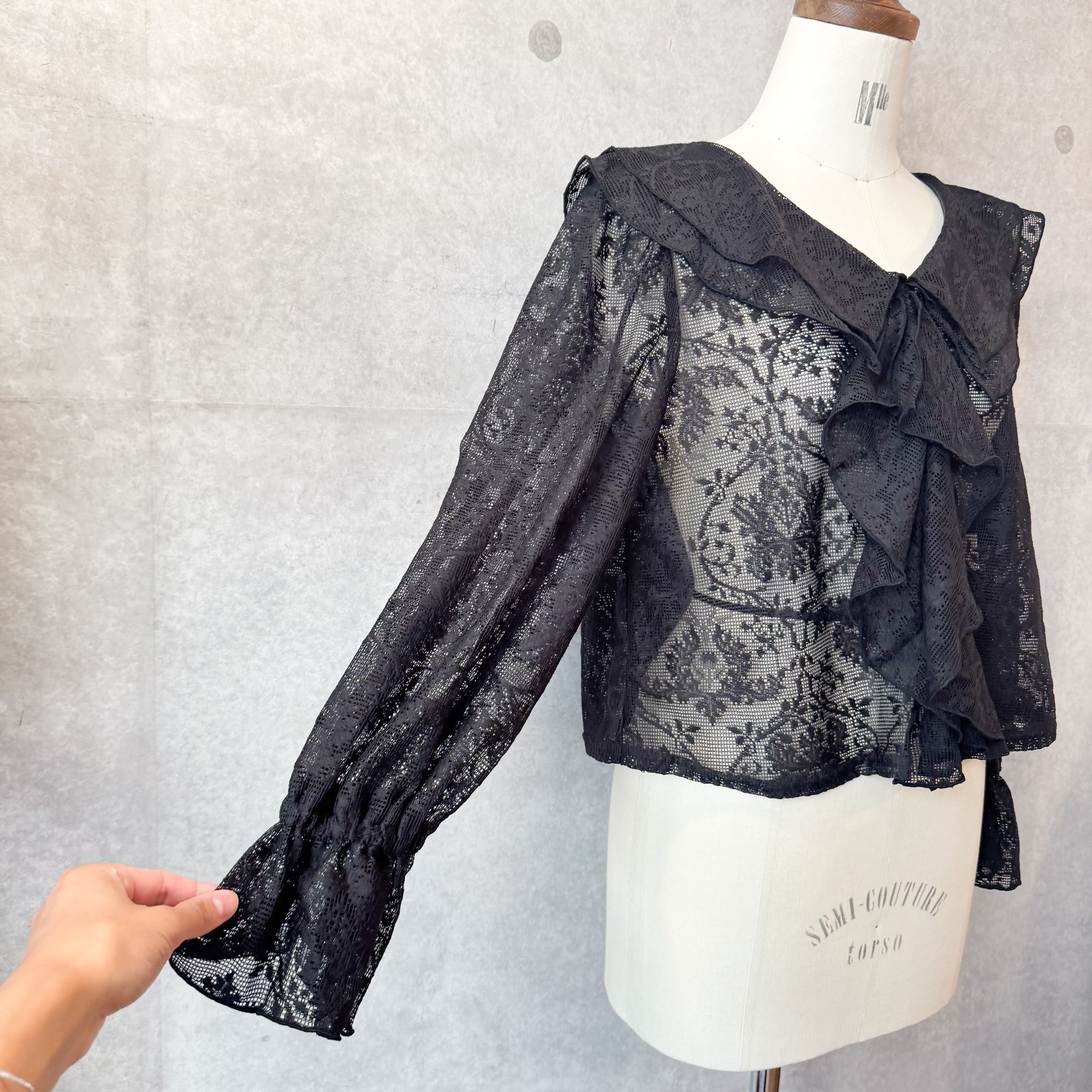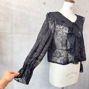 襟元から裾に向かってフリルデザインが施された華やかなブラウス。