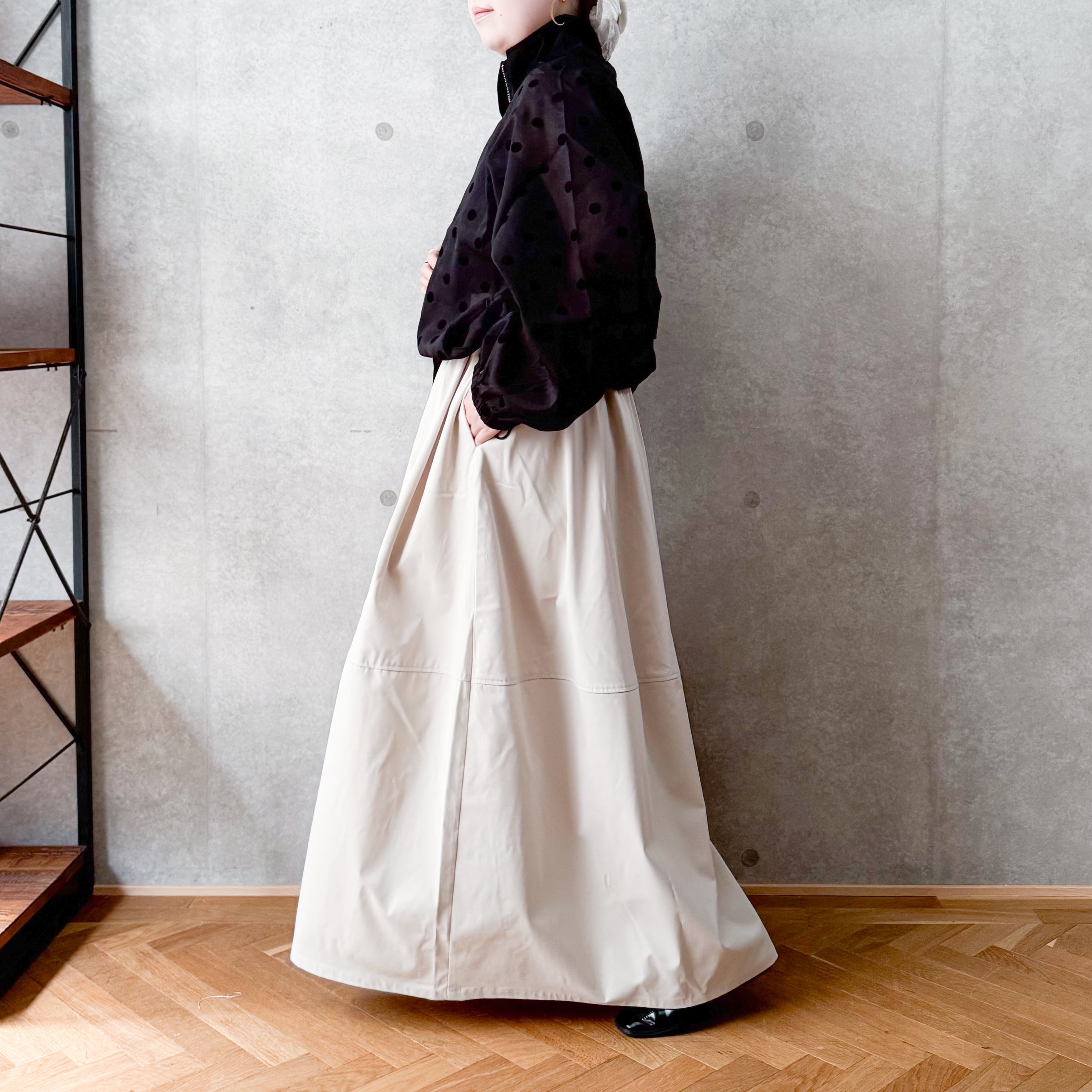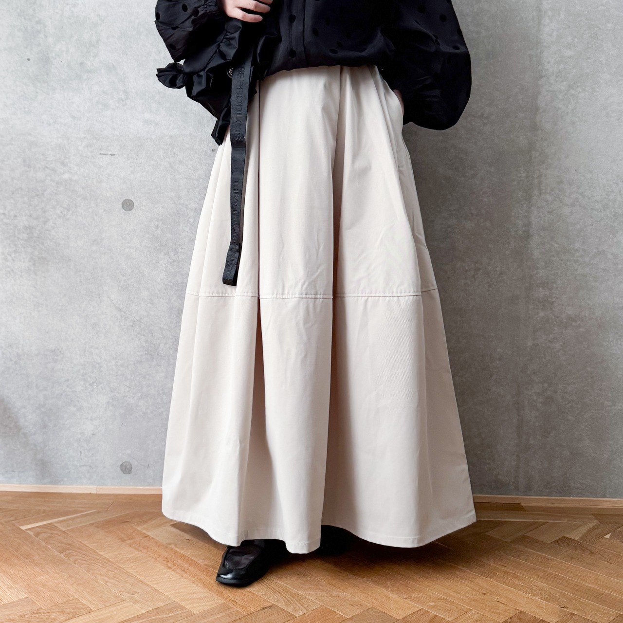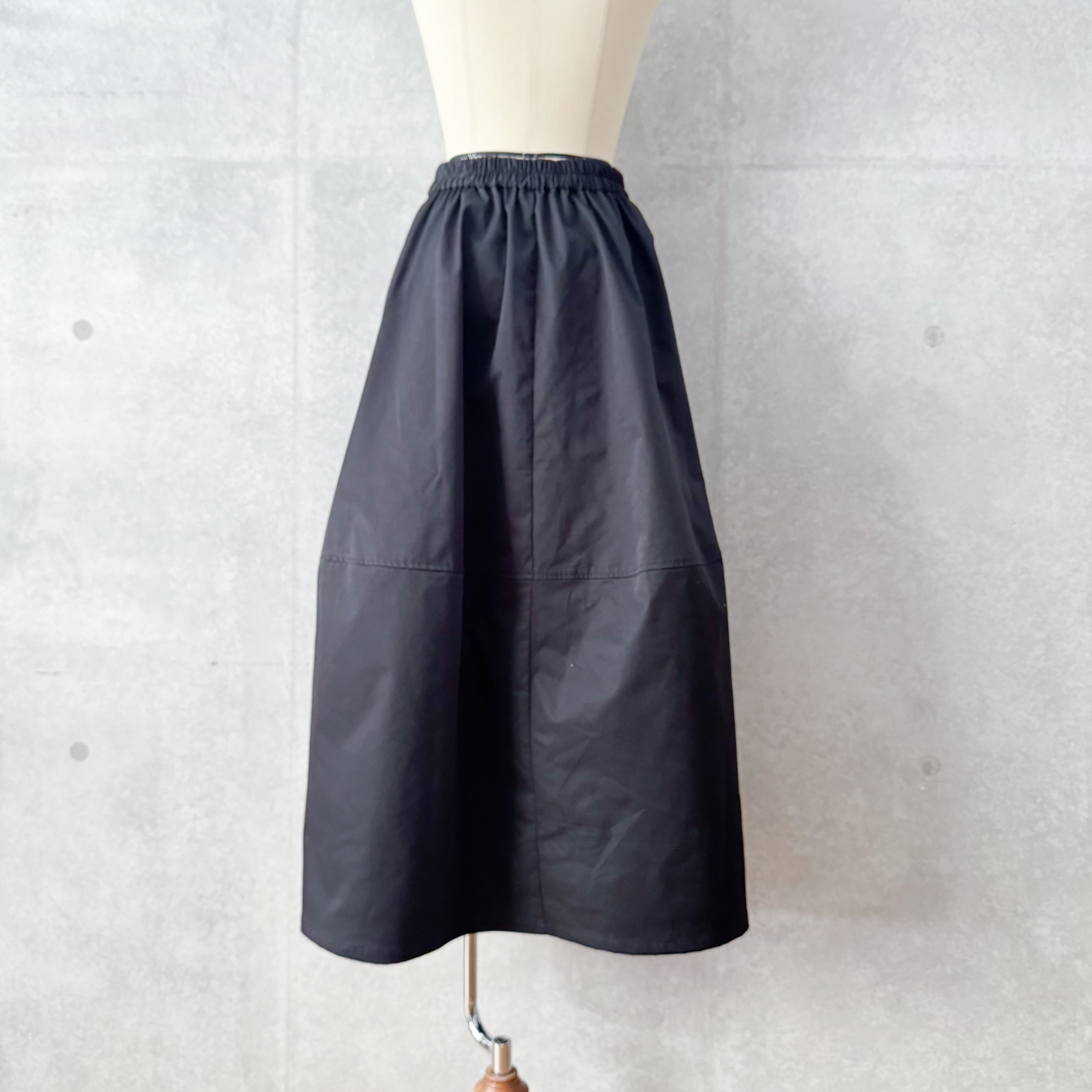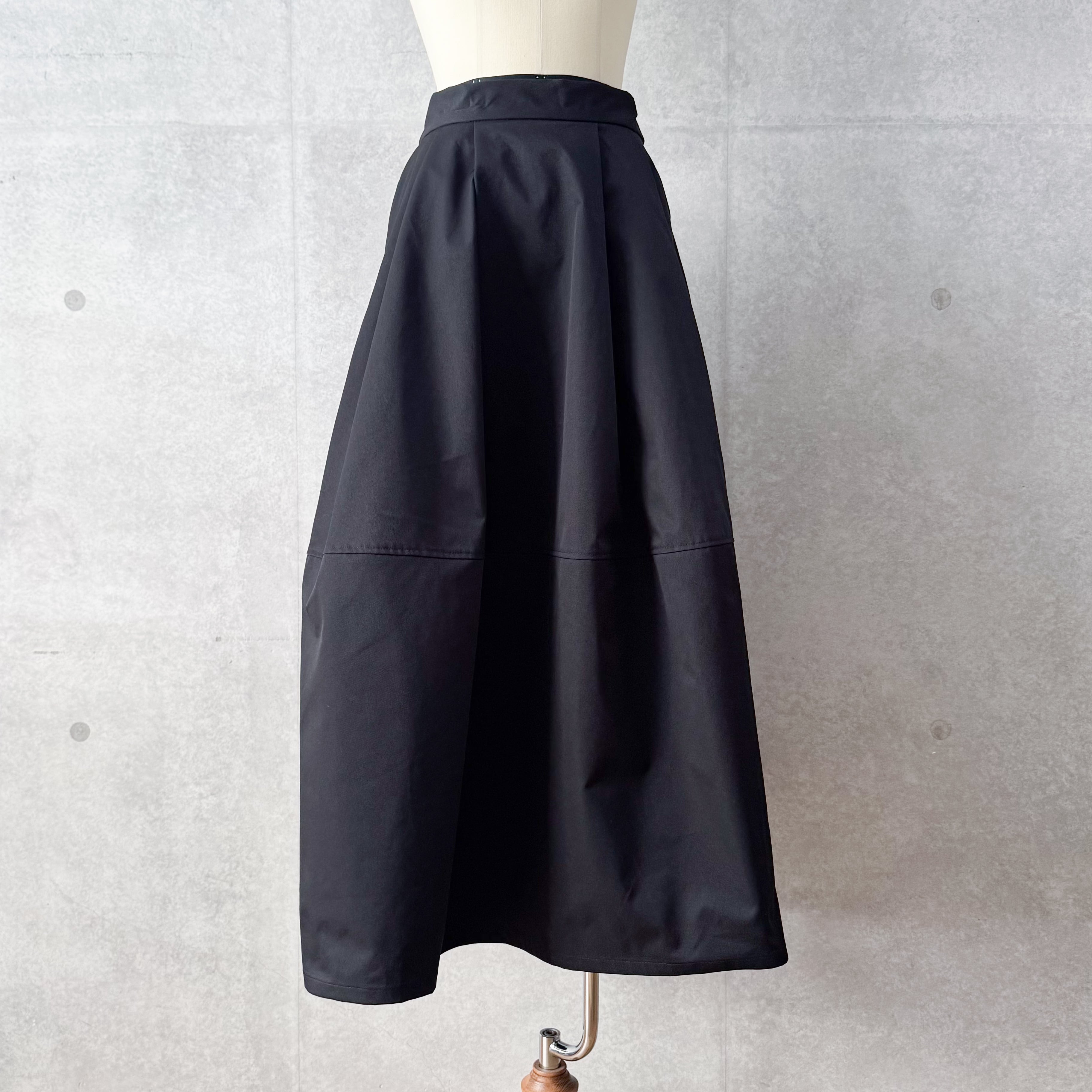 程よく広がるAラインシルエットと切り替え部分から少し丸みのある形になっていて細部までデザイン性の高い一着です。ポケット付きです。