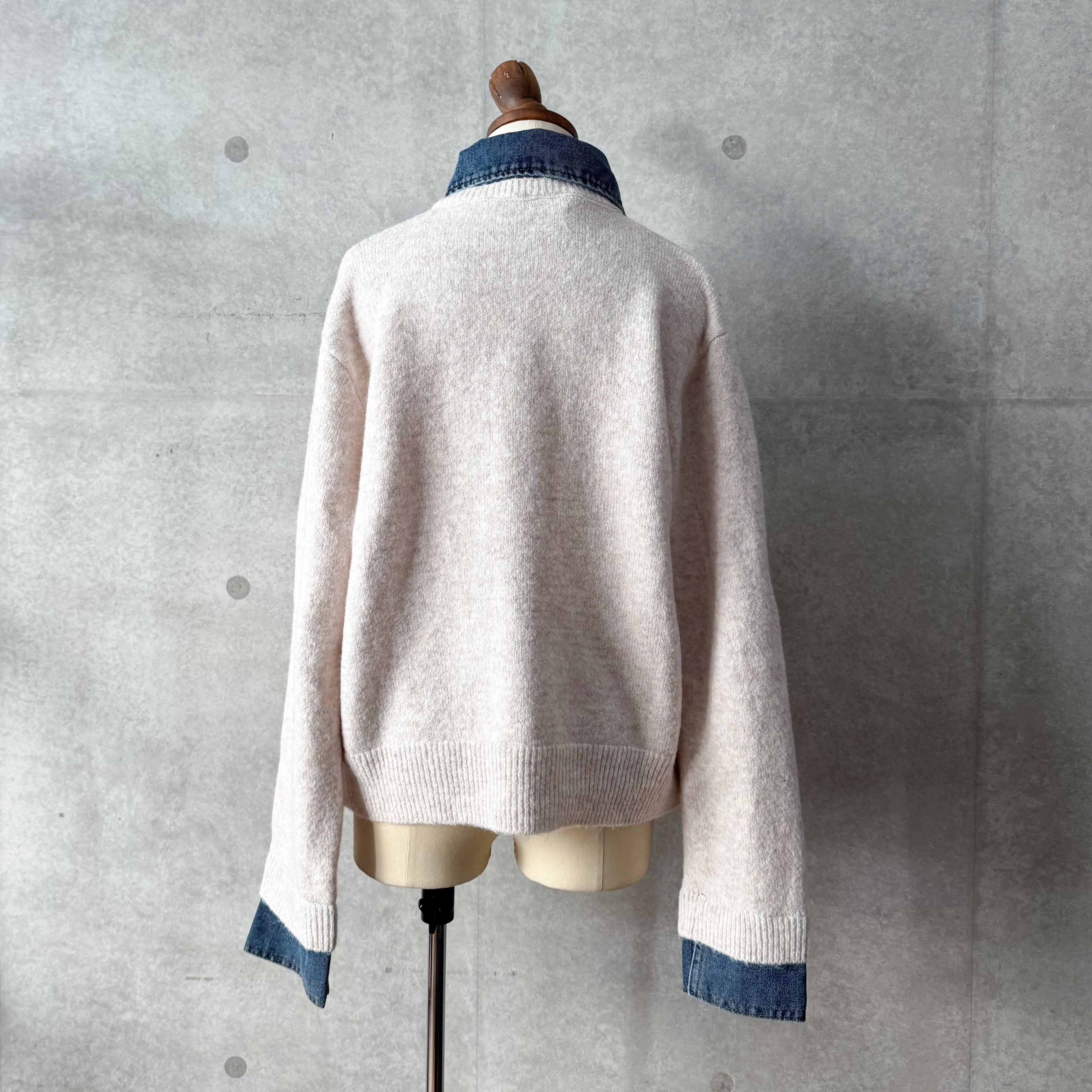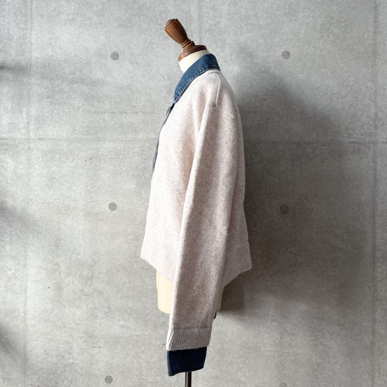 カーディガンとデニムがドッキングされたニットカーディガン。