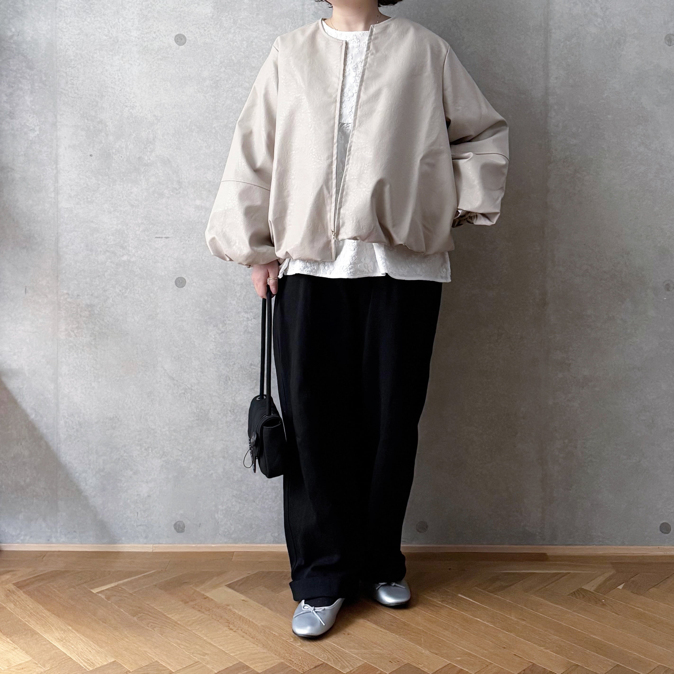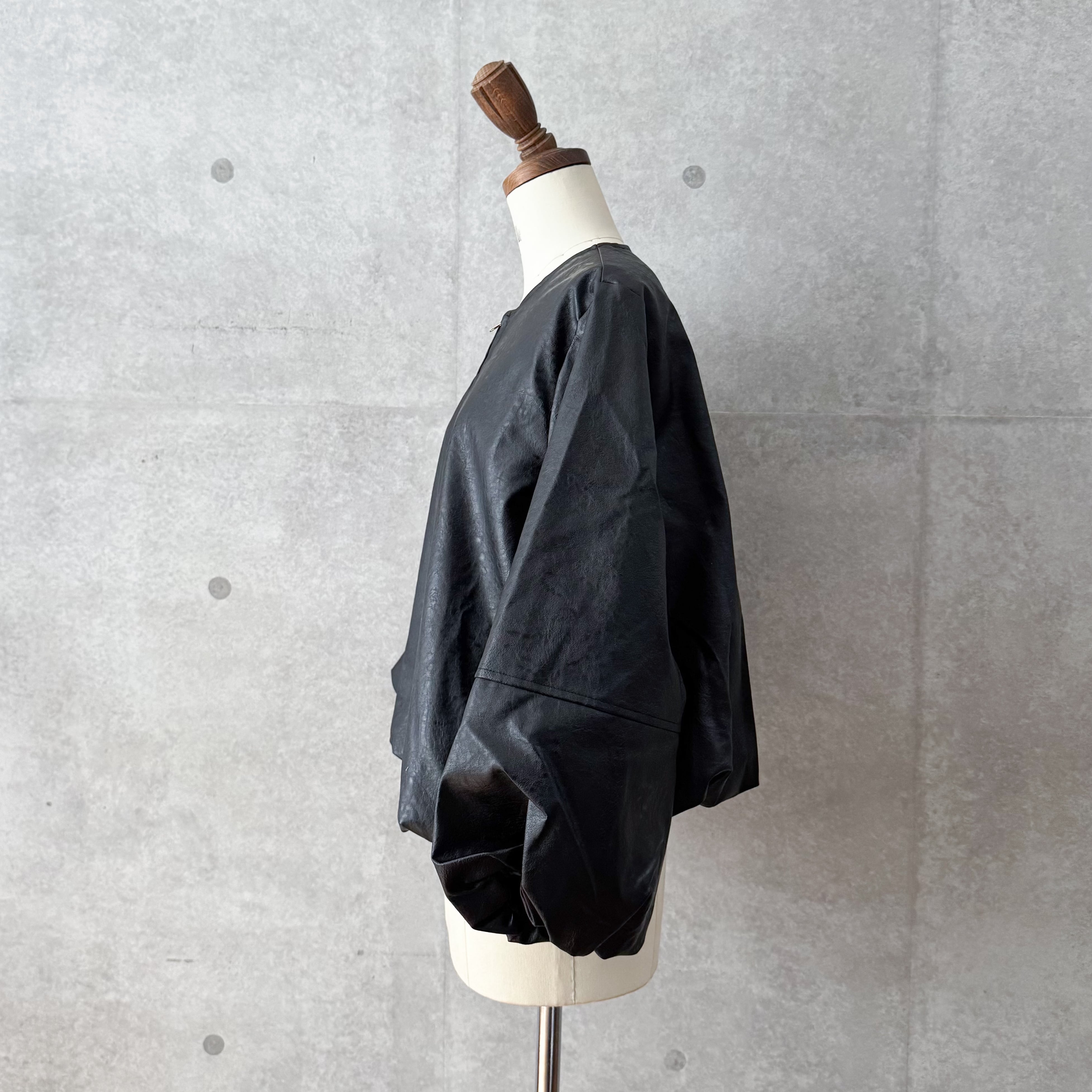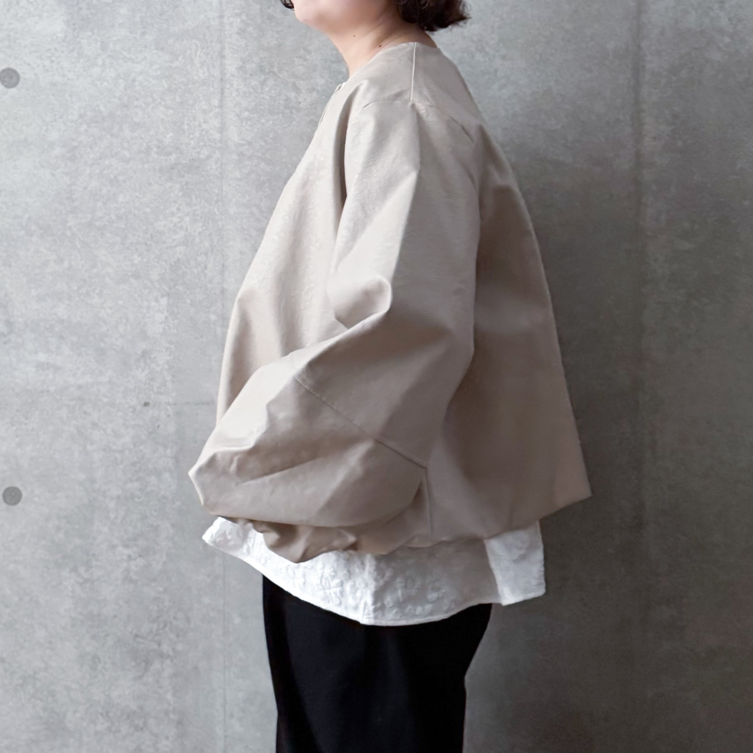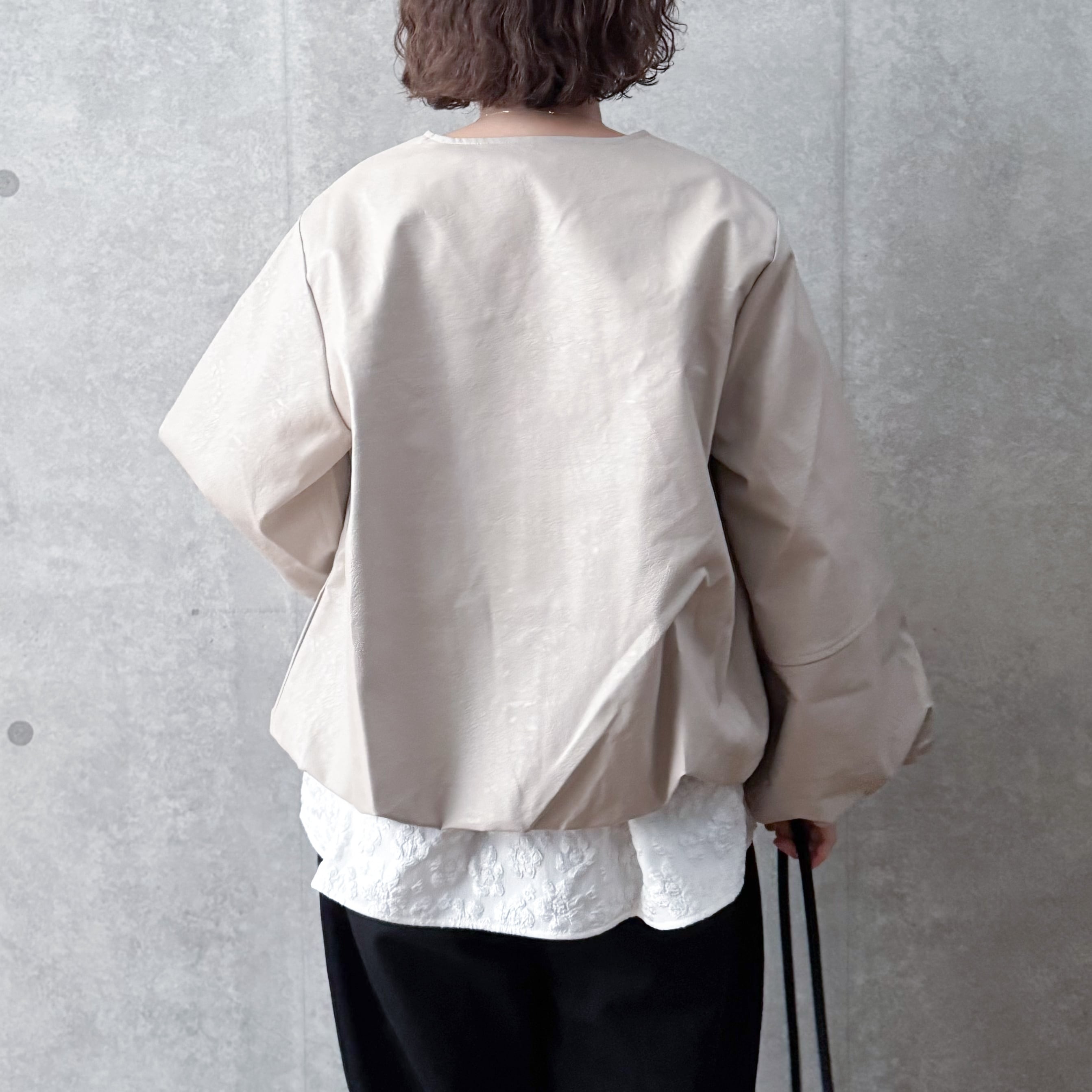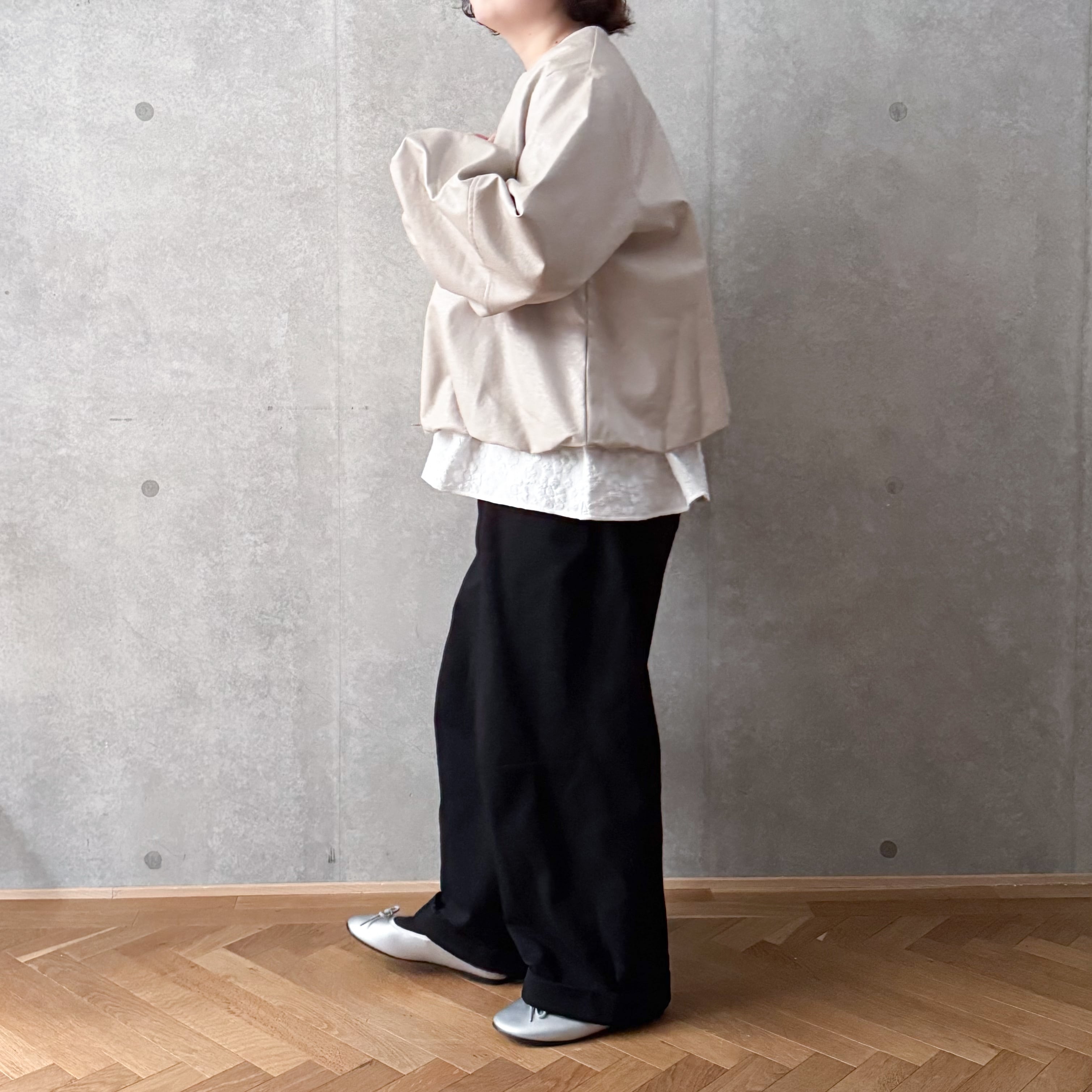 ハードになりすぎないクルーネックデザインとたっぷりとしたお袖が女性らしい雰囲気です。