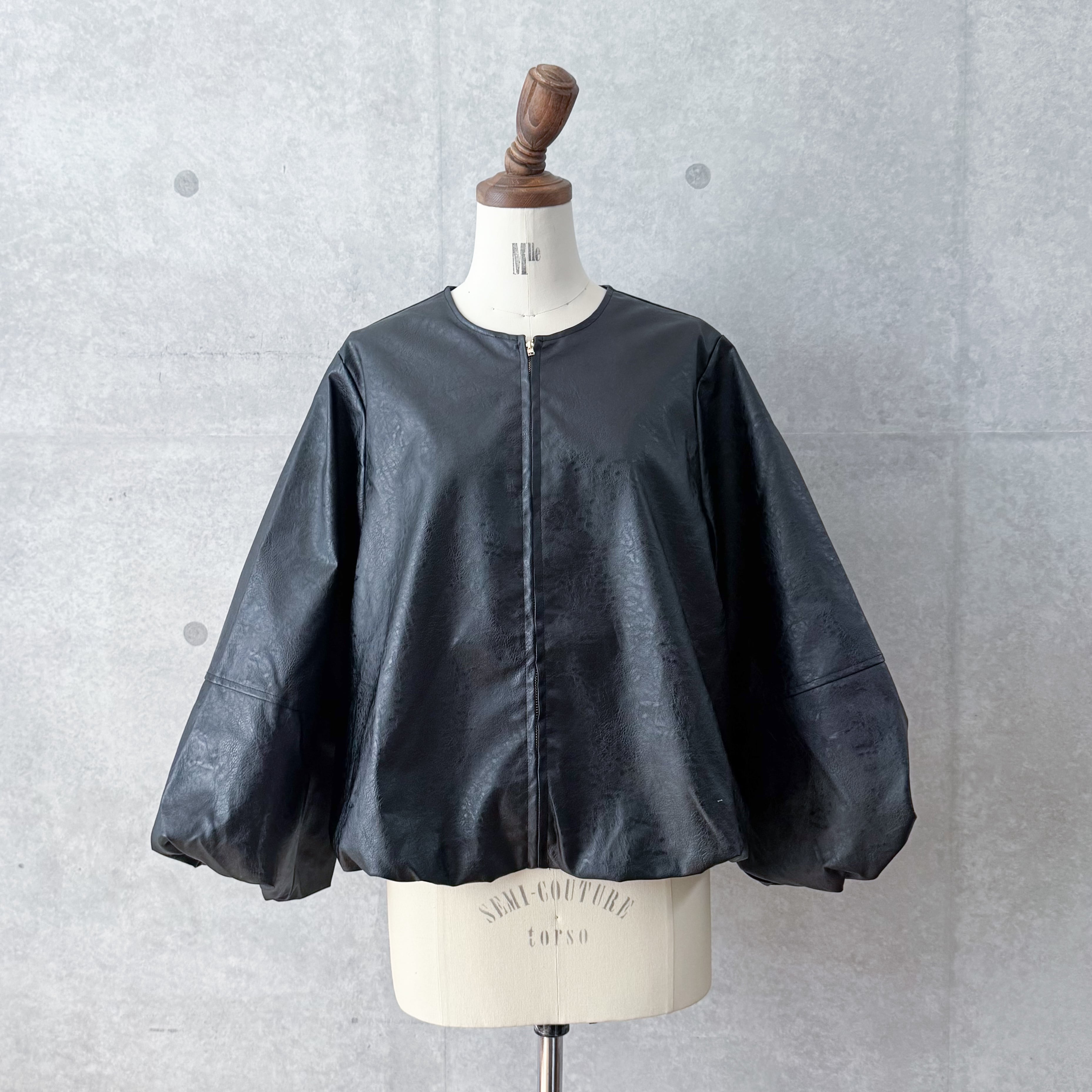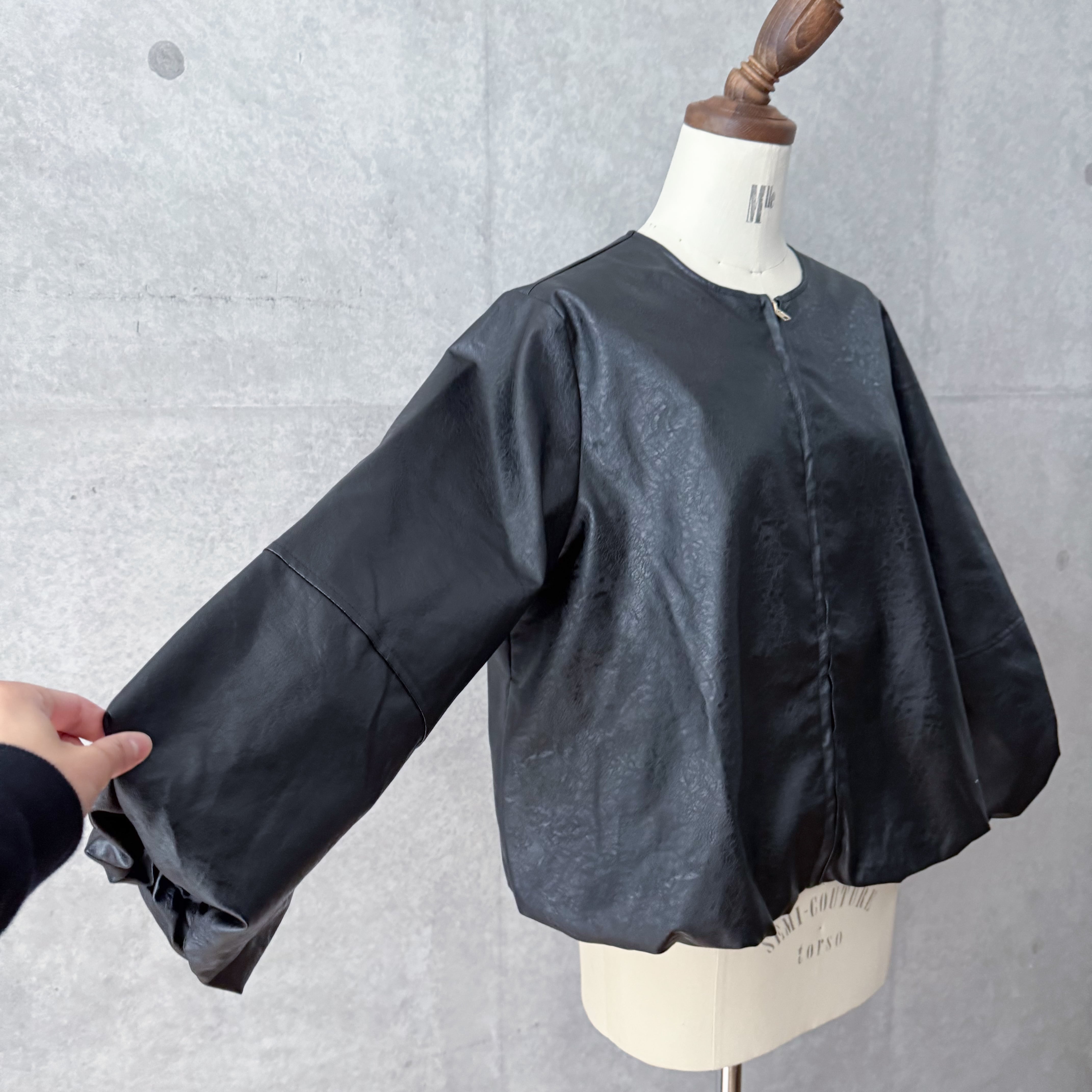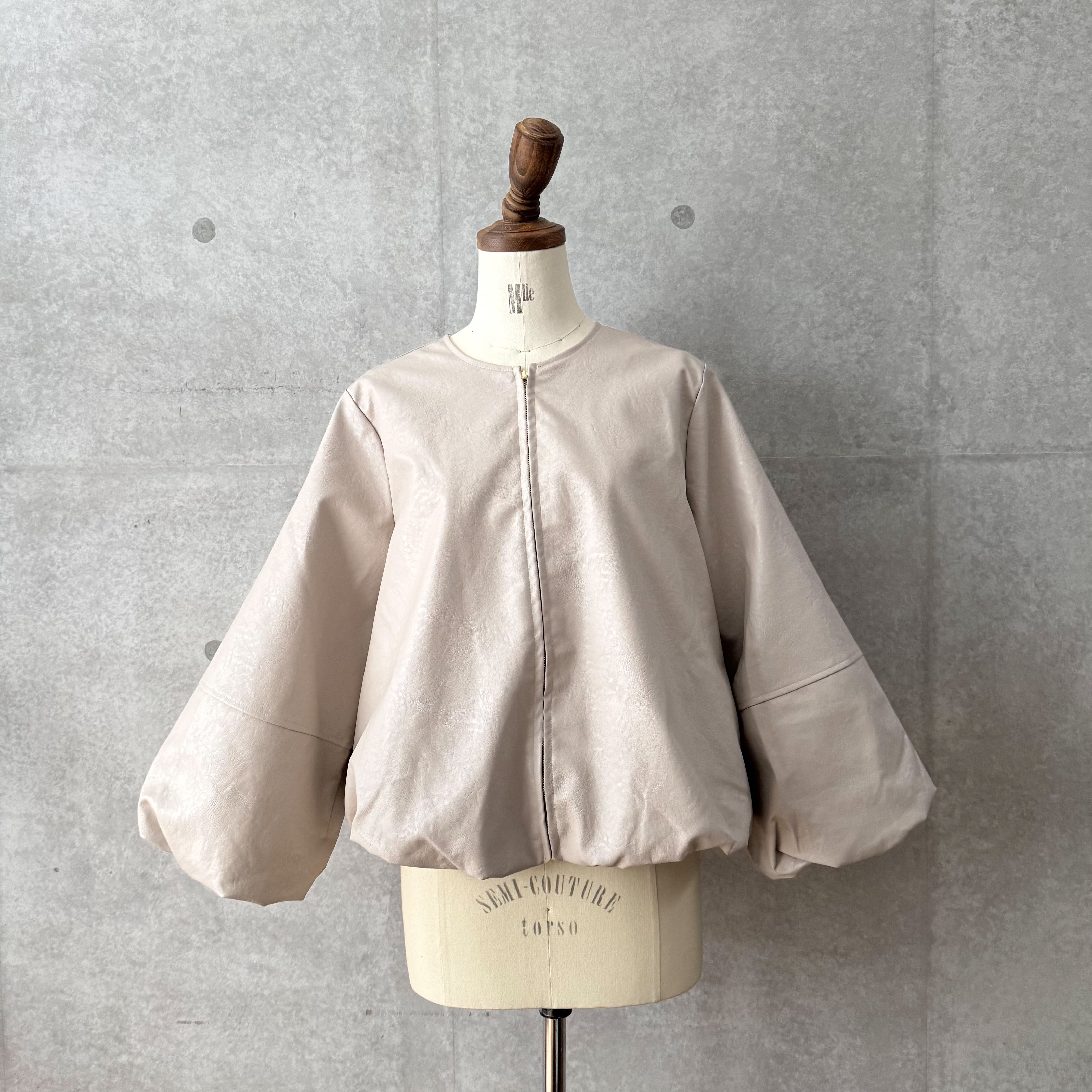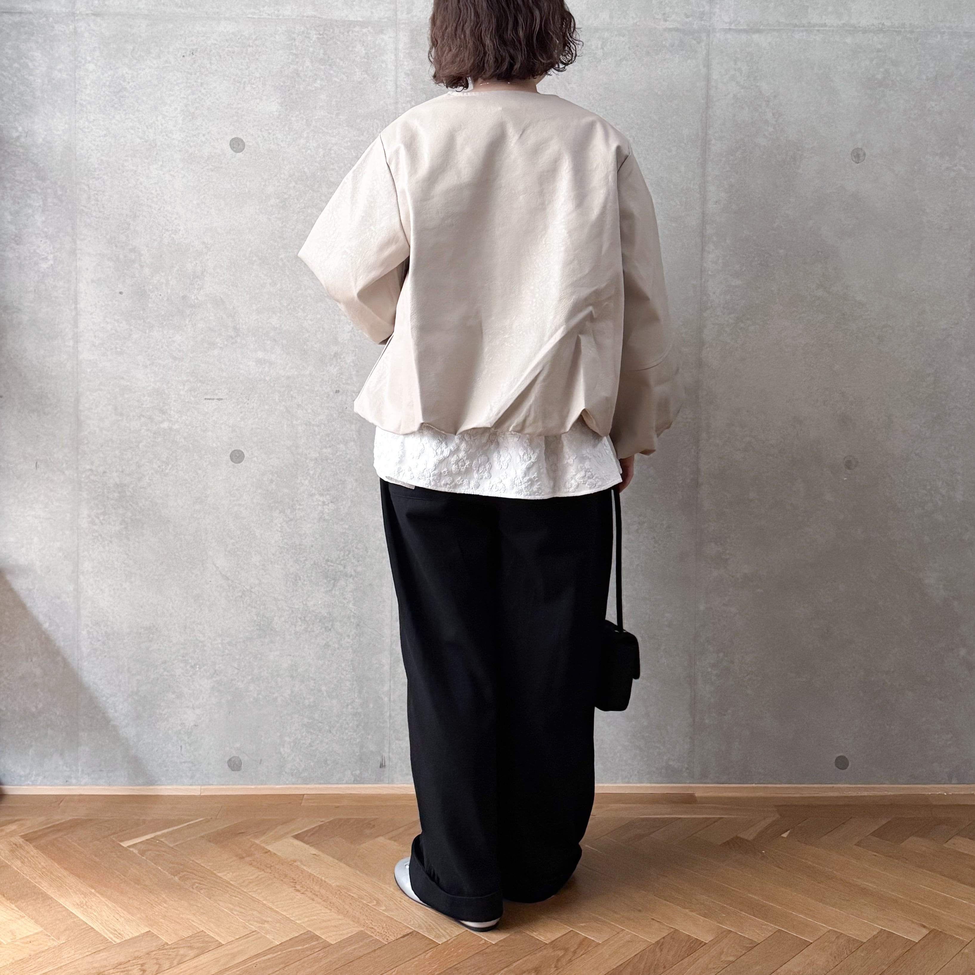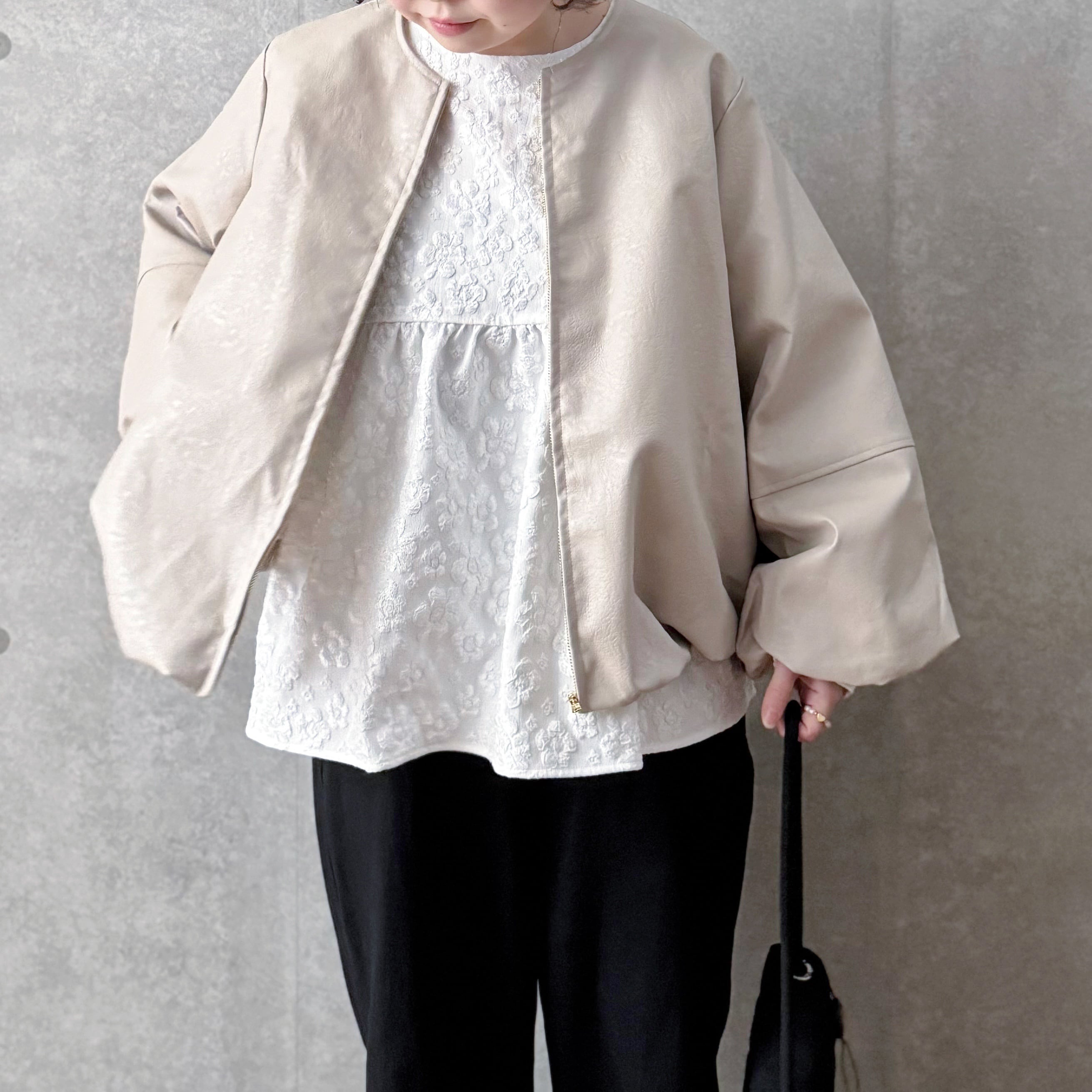 ハードになりすぎないクルーネックデザインとたっぷりとしたお袖が女性らしい雰囲気です。