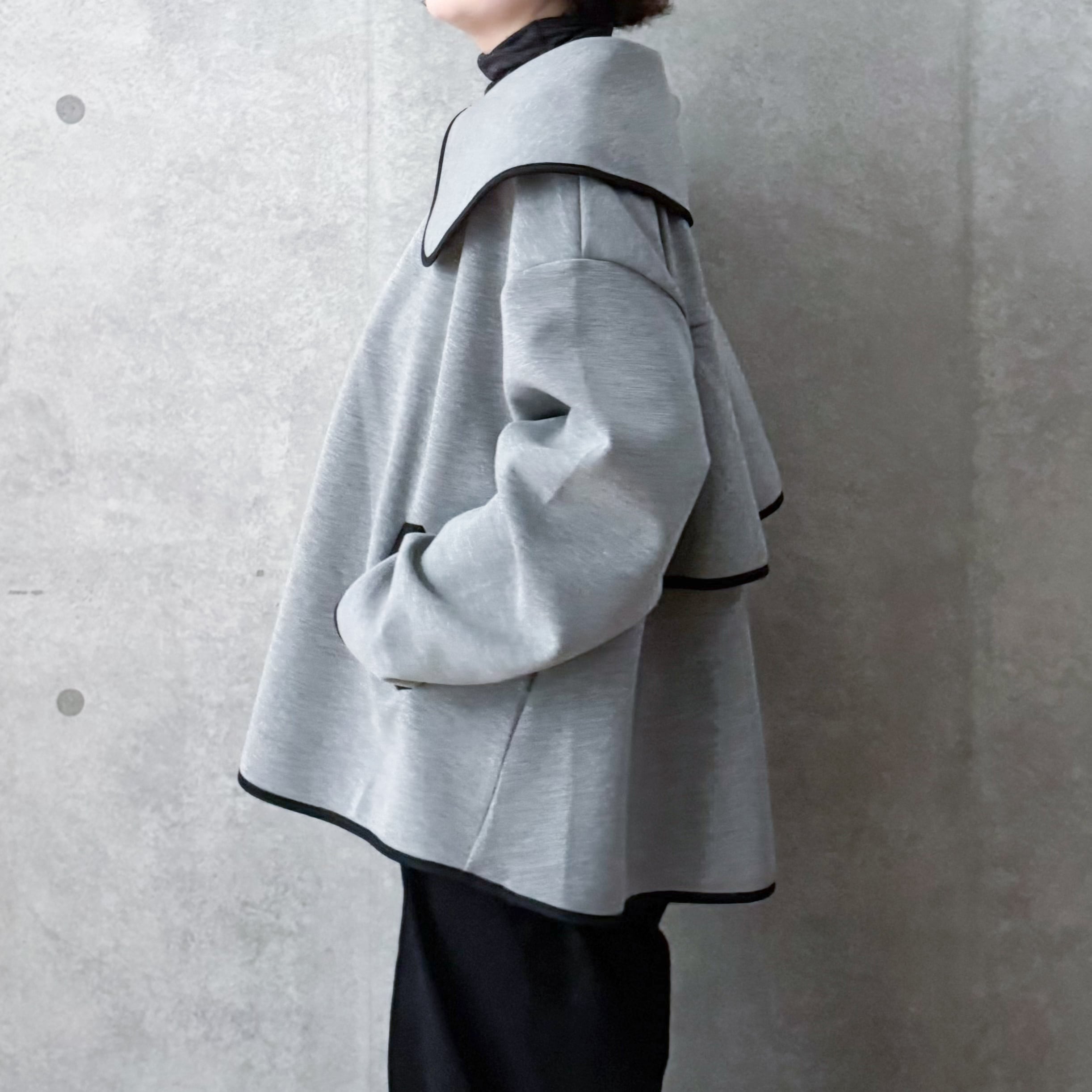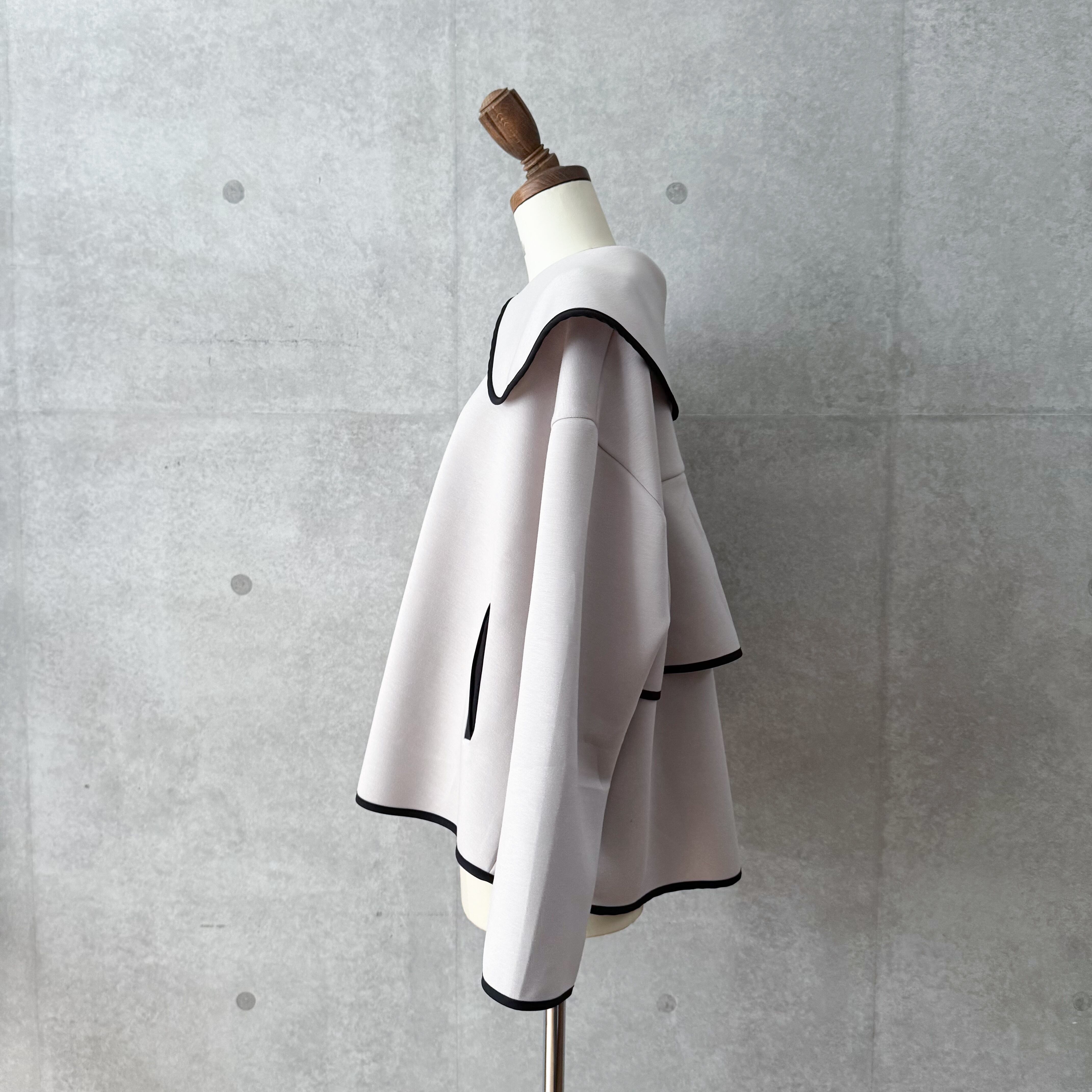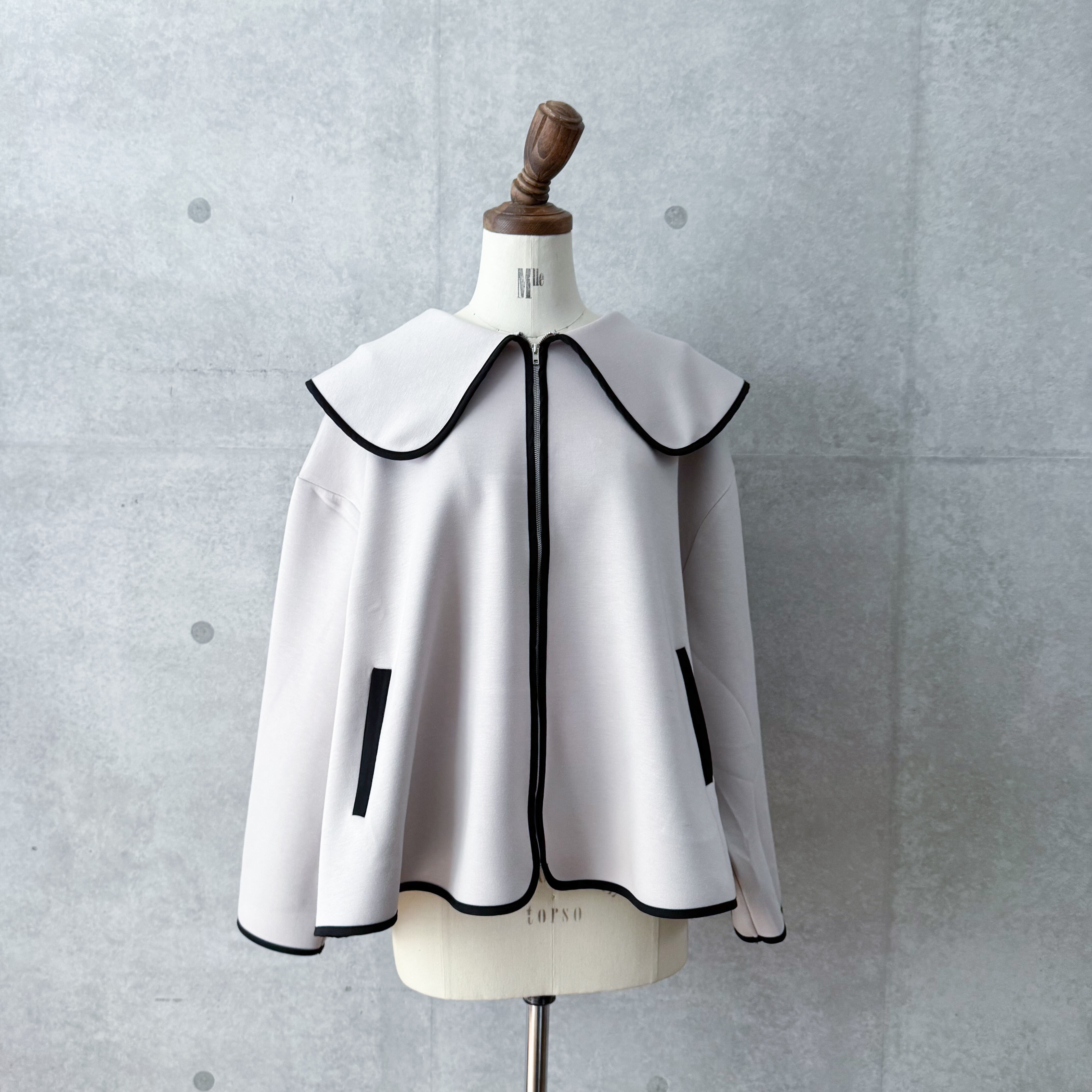 大きな襟が目を惹くパイピング襟ジャケット。