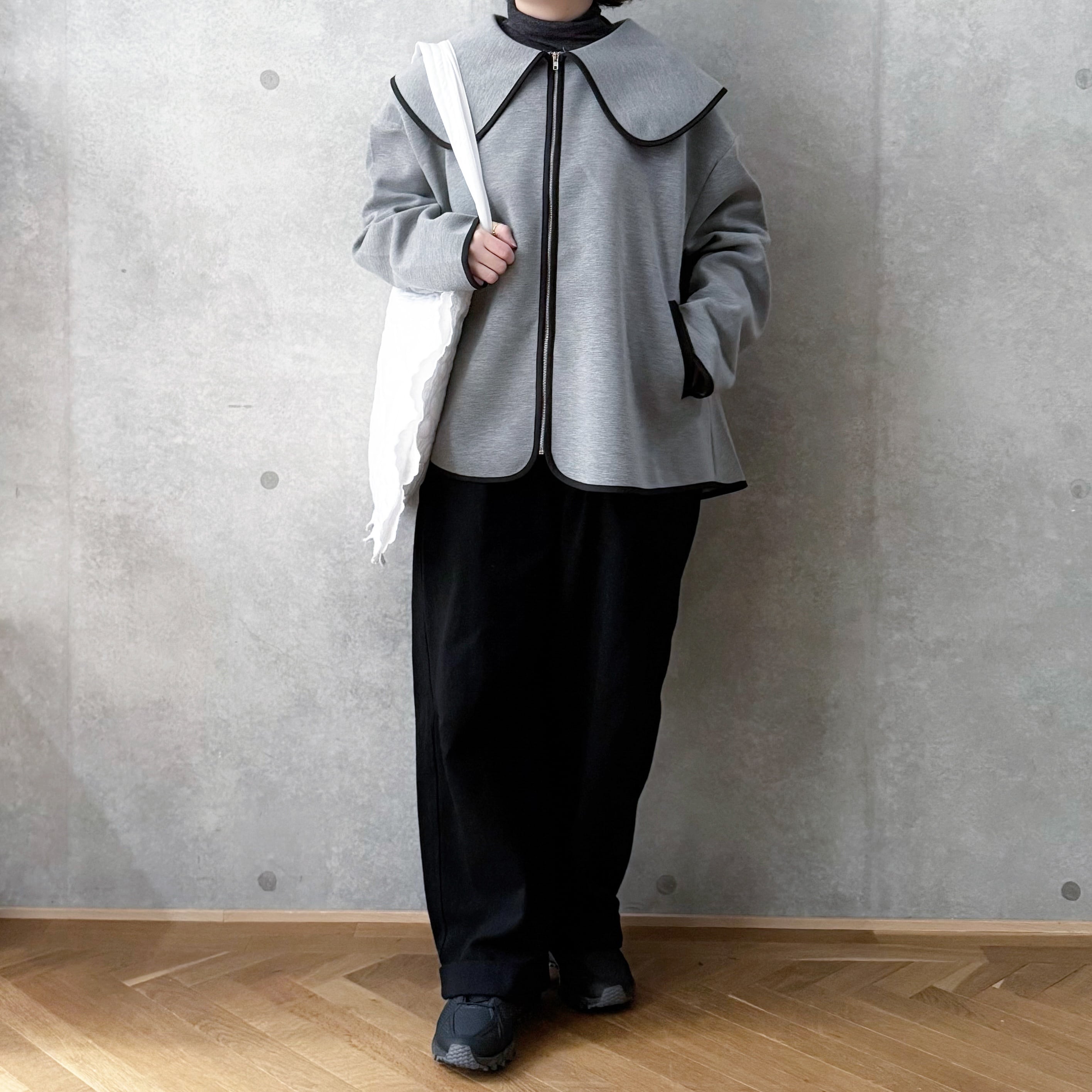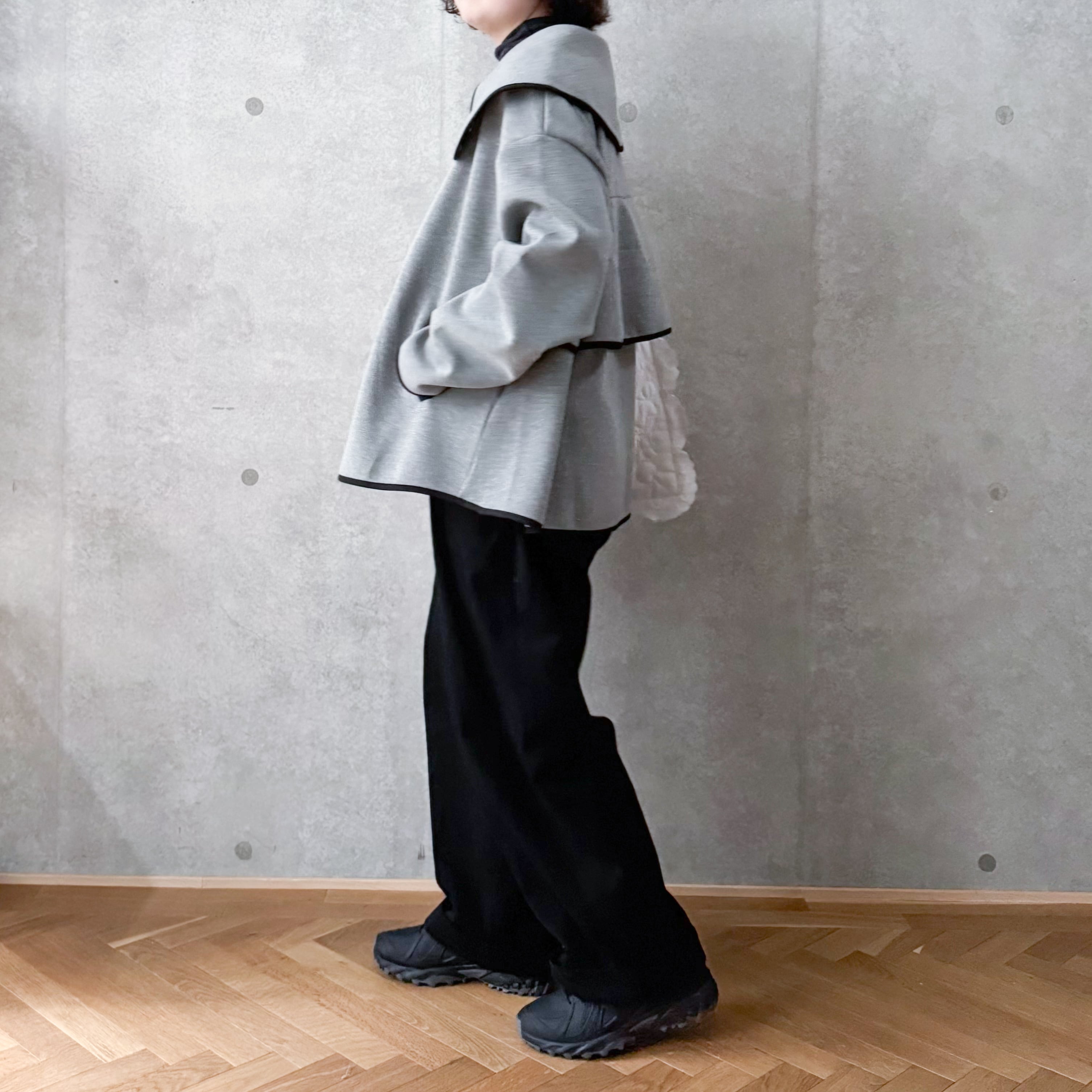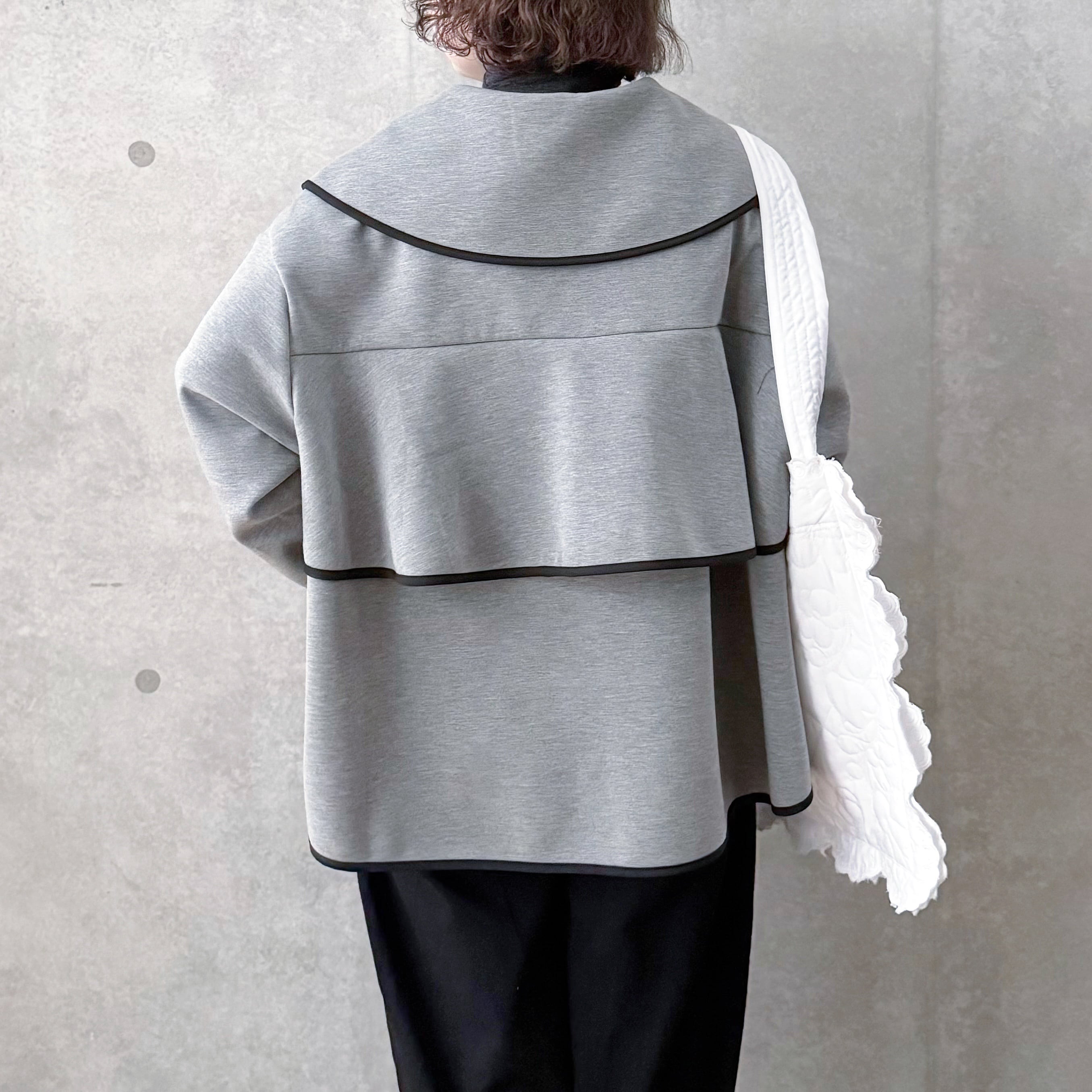 大きな襟が目を惹くパイピング襟ジャケット。