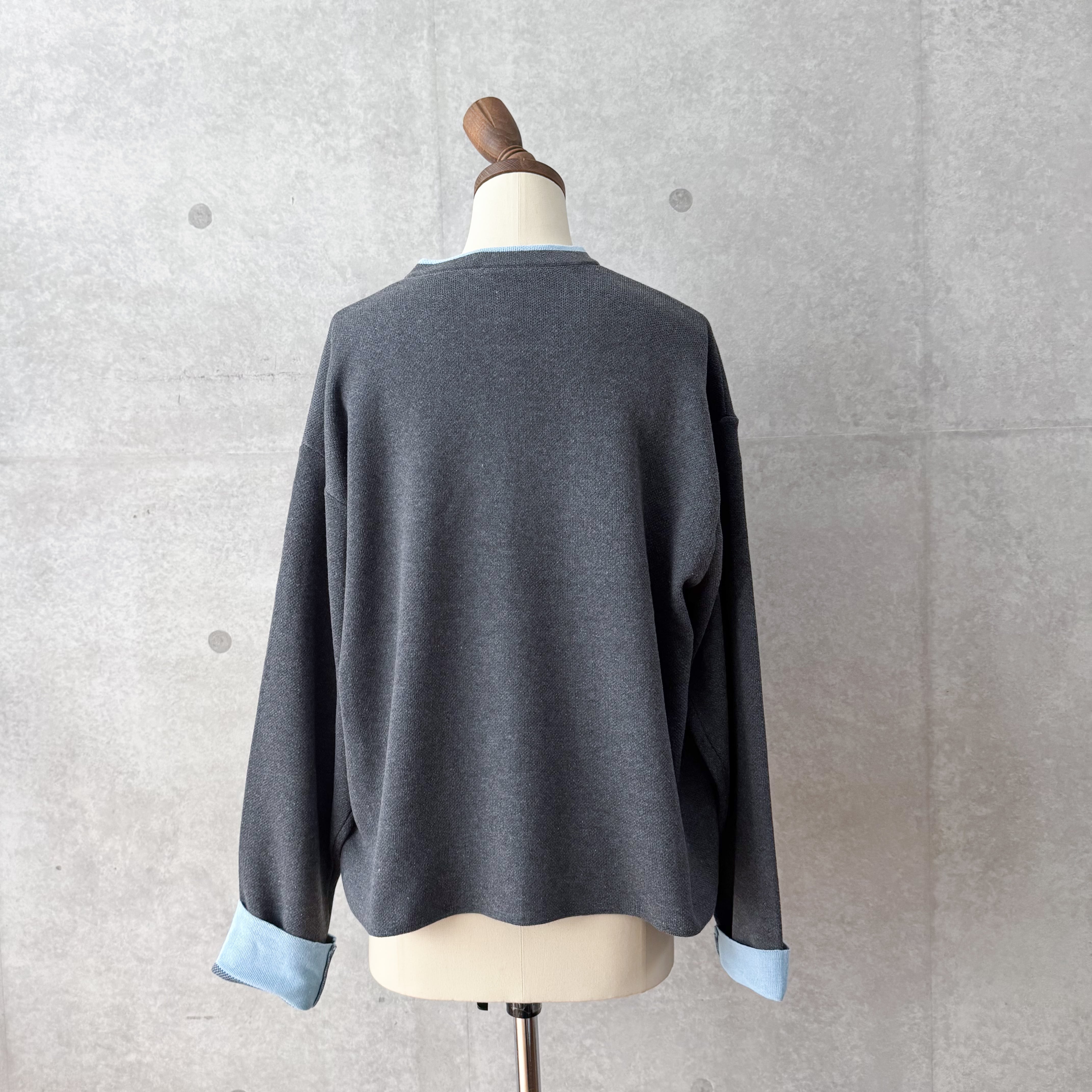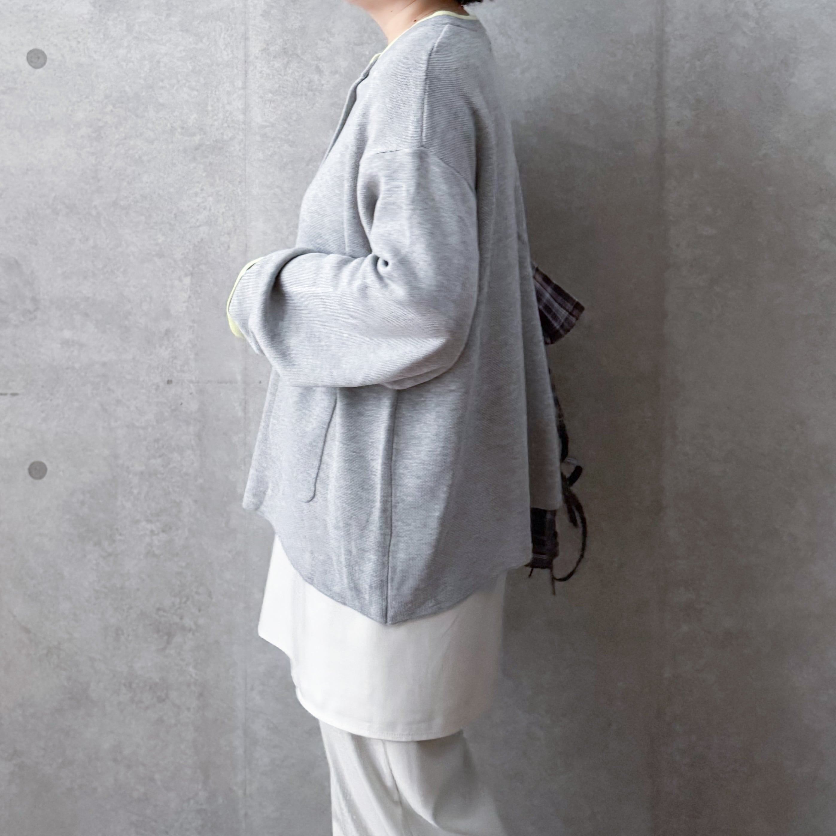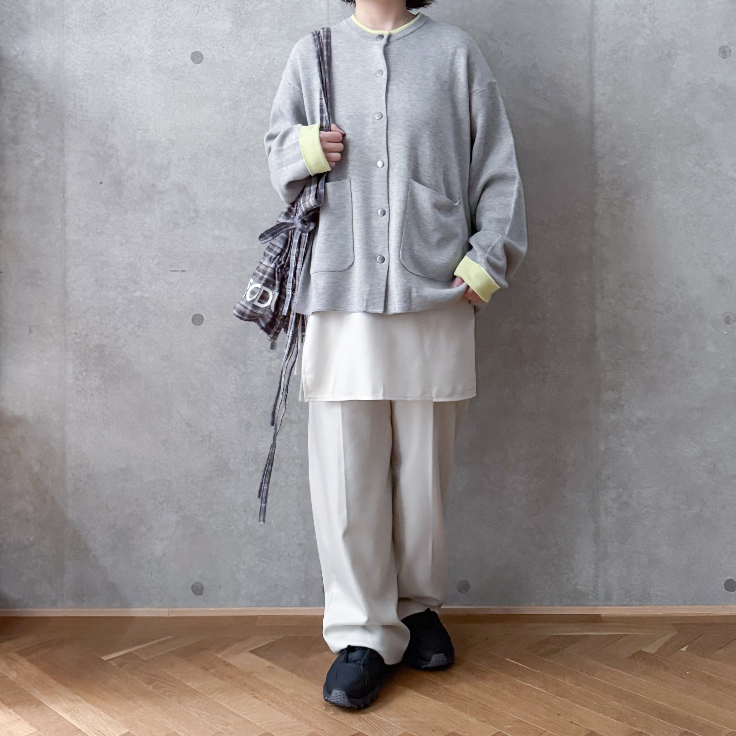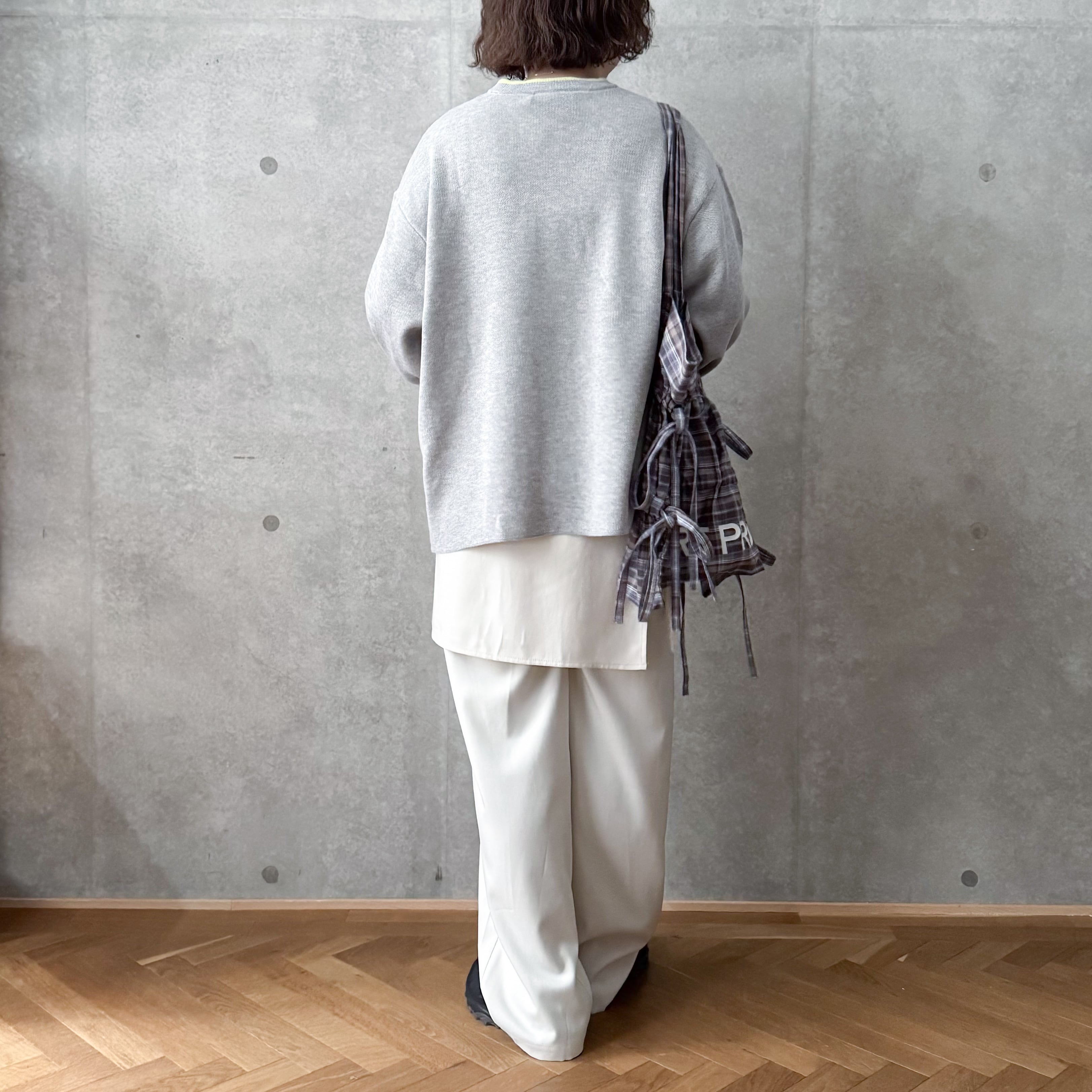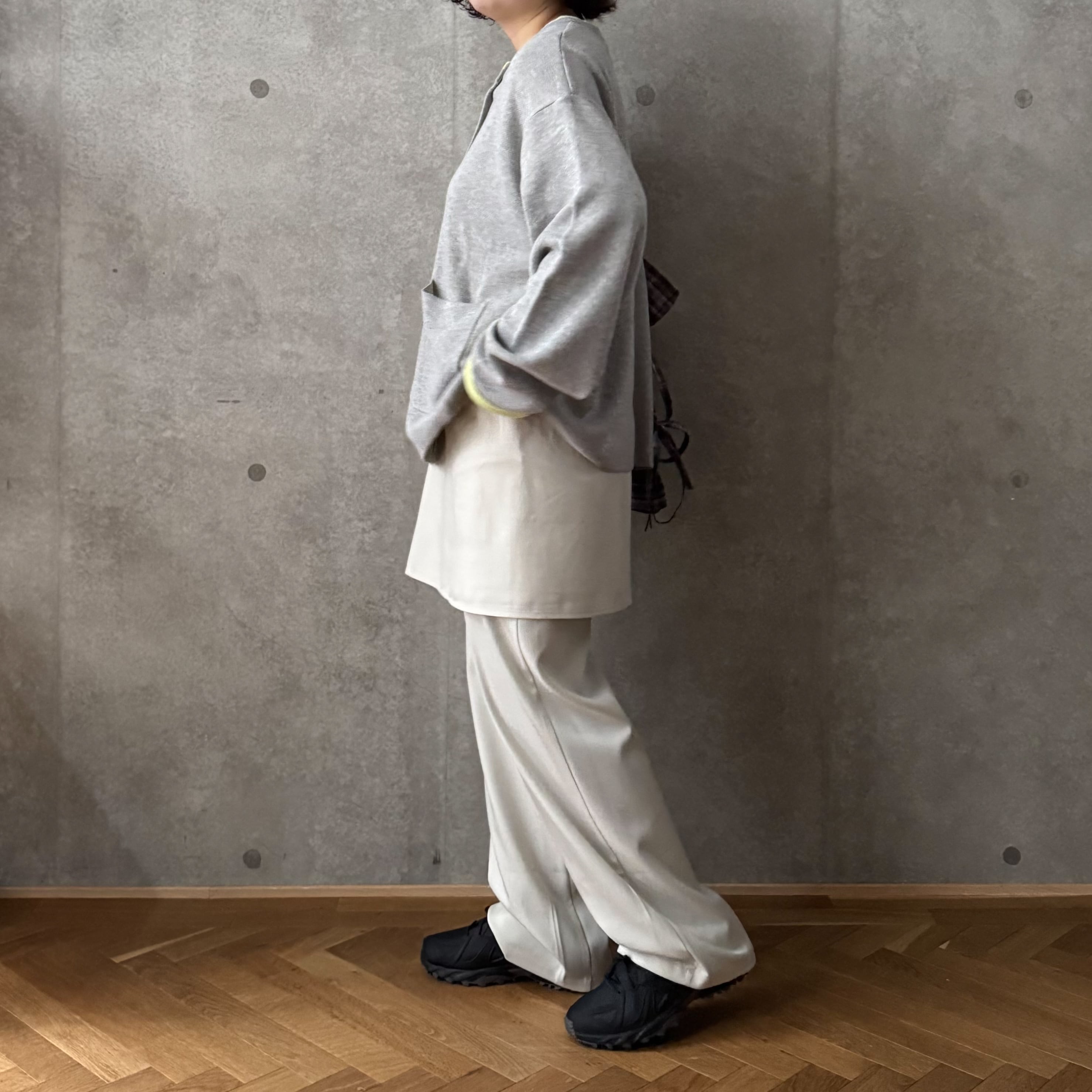 ゆったりとしたサイズ感なので今の季節は薄手のニットトップスと重ねても
